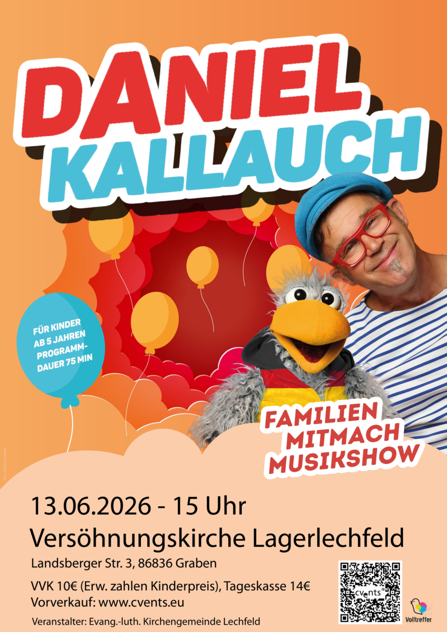 Zum Jubiläum "60 Jahre Versöhnungskirche" kommt der bundesweit bekannte Kindermusiker und Puppenspieler Daniel Kallauch mit seinem neuen, knallvergnügten Programm auch ins Lechfeld.